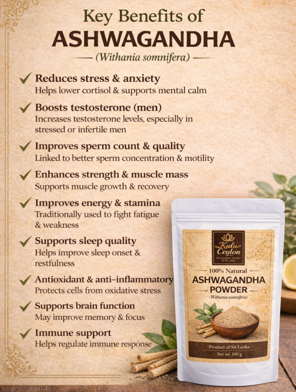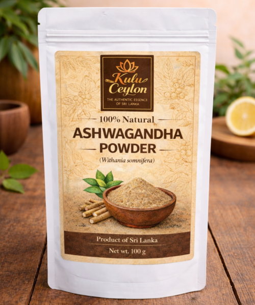 Kulu Ceylon Ashwagandha Powder is made from carefully selected ashwagandha roots, finely processed to retain their natural potency. Traditionally valued in Ayurveda as an adaptogenic herb, it is used to support balance, resilience, and overall well-being. 100% pure, with no additives, and proudly sourced from Sri Lanka.