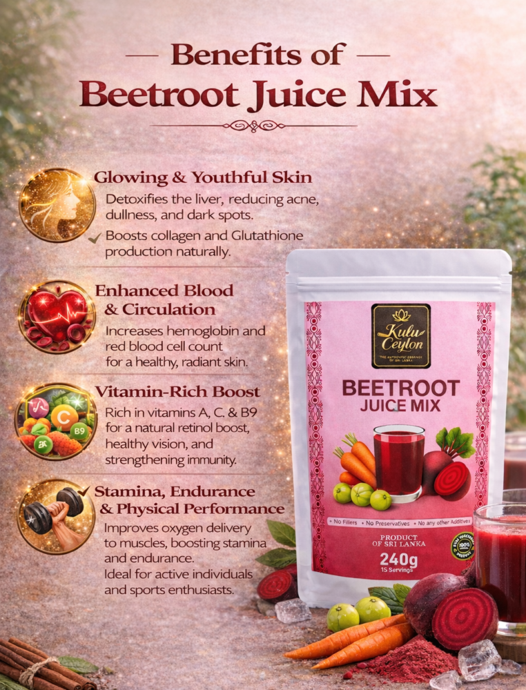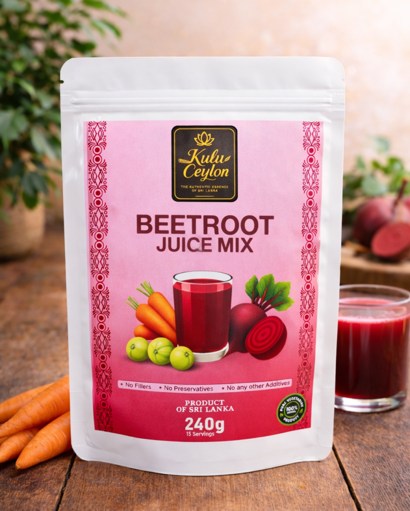 At Kulu Ceylon, we’ve brought together **three of nature’s most powerful superfoods—Beetroot, Carrot, and Amla—**into a single, convenient juice mix. Now, enjoying the goodness of these nutrient-rich ingredients is easier than ever, all in one easy-to-use product.