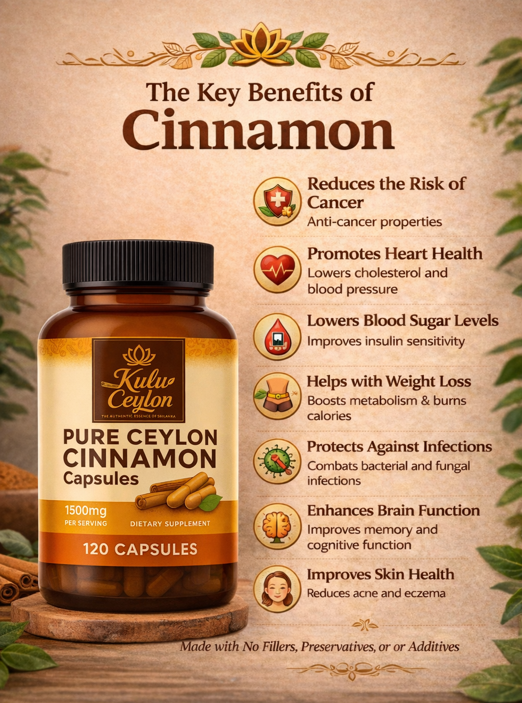 Ceylon cinnamon contains over 80 chemical compounds, including cinnamaldehyde, cinnamic acid, and cinnamate. Beyond its rich flavor, it provides numerous health benefits and helps reduce the risk of diseases, disorders, and even cancer.